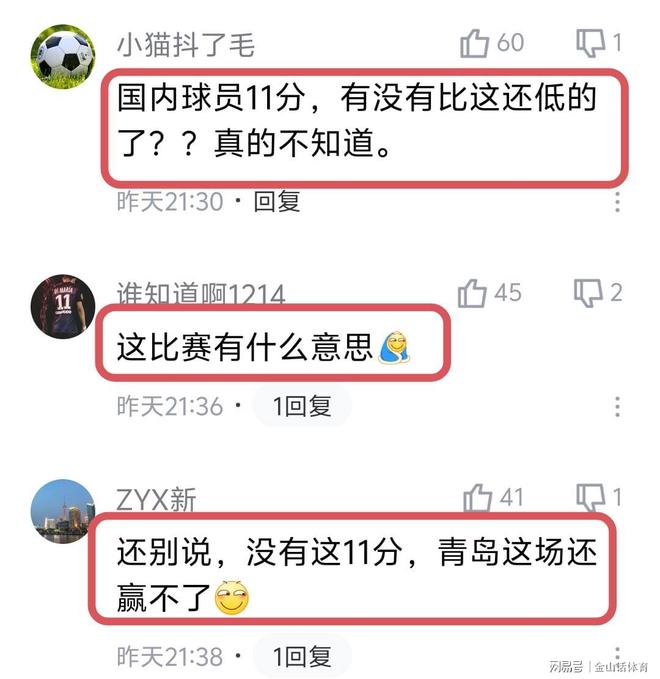 针对青岛队外援得88分,国内球员得11分的奇葩观象,网友们纷纷吐槽道“青岛完全没有战术,就是抡老外赢球赚门票,脸都不要了。”;“毫无意义的比赛,就看外援抡了,这样下去国家队只会越来越差。”;“国内球员11分,有没有比这还低的了??真的不知道。”;“这比赛有什么意思[盖被子”;“还别说,没有这11分,青岛这场还赢不了”。