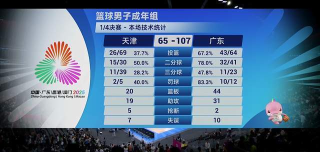 其实,领先那么多,胜负的悬念就没了,广东队要顺利挺进4强了。杜锋在第四节安排替补出击,却依旧在拉大分差。看来,天津队在小组赛的强大,在强敌面前,都是纸老虎一般的。广东队继续猛攻,把领先优势拉大到了40+。最近,广东全运男篮以107-65大胜天津队42分,昂首挺进4强。广东队半决赛的对手将是辽宁队,辽粤大战,静待好戏。