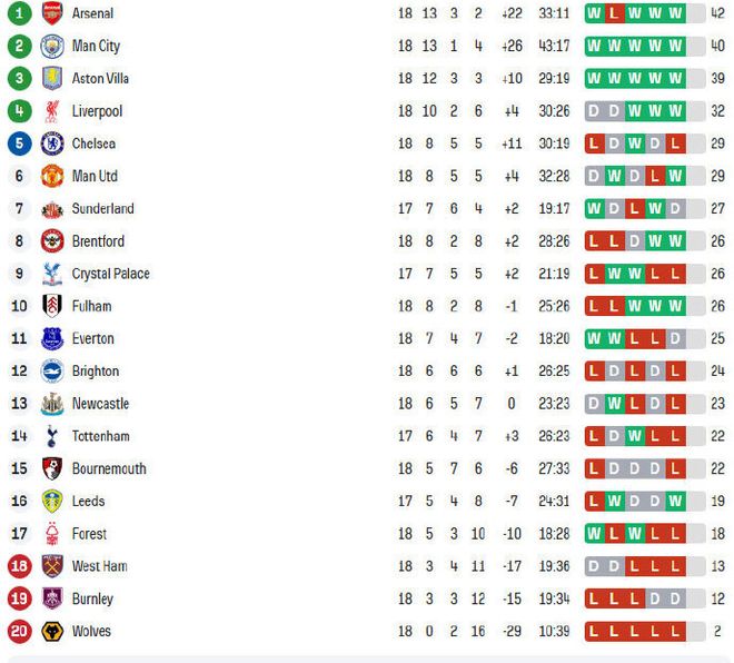 领头羊阿森纳尽管面临曼城巨大的追分压力,但依然在主场2-1力挫布莱顿,阿森纳各项赛事也取得了5连胜。本轮过后阿森纳18轮积42分,继续以2分优势力压曼城,领跑积分榜。